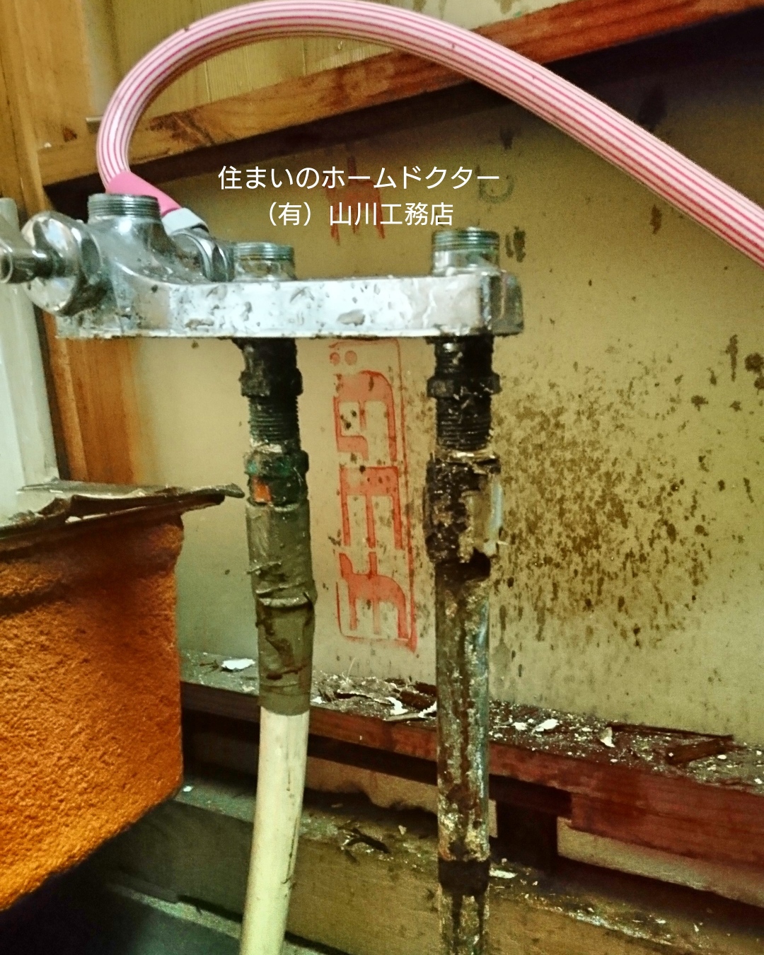 ユニットバス入れ替え工事の進行状況です。腐食した水道配管がとても危険な状態でした。