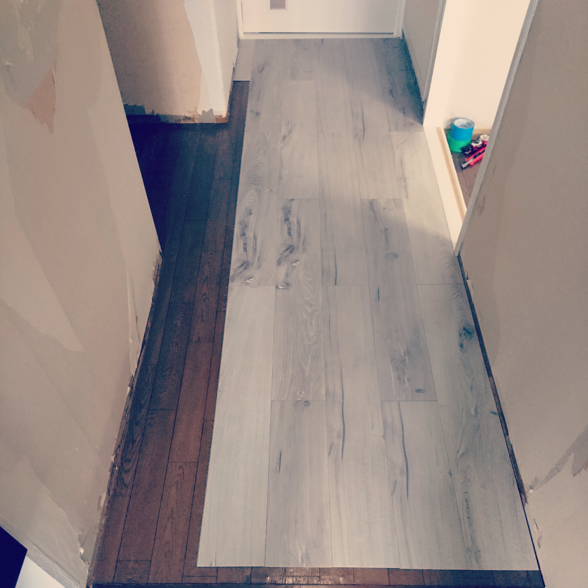 住居の床の増し張り工事を進行中です。こちらでは1.5mmのフロア材を使用しているため、段差がほとんどありません。当社ではおすすめしている商品です(^_^)